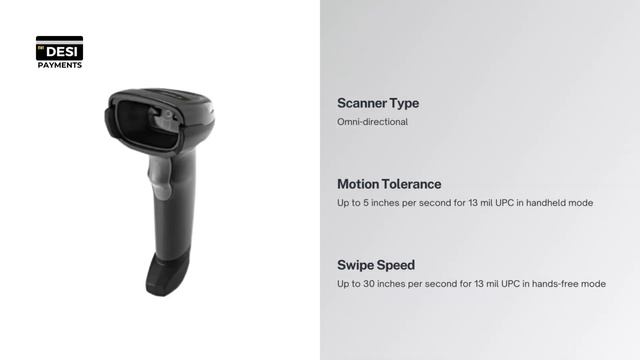 Handheld barcode scanner Zebra DS2208 A simple plug-and-play scanner that captures both 1D and 2D barcodes from paper labels, phone screens, and high-density (HD) barcodes used in specialty retail and electronic manufacturing. An optional stand enables automatic switching between handheld and hands-free modes. Scanner Type Omni-directional Motion Tolerance Up to 5 inches per second for 13 mil UPC in handheld mode Swipe Speed Up to 30 inches per second for 13 mil UPC in hands free mode Hands Free Hands free when used in continuous scanning mode and placed in the stand Durability Can withstand drops up to 5 feet For more information please visit ?: https://www.desipayments.com/? Call ?: (208) 337-7755 Email ?: Jamil@Desipayments.Com Instagram ?: https://www.instagram.com/desipayments/ Facebook ?: facebook.com/DesiPayments/ Twitter ?: https://twitter.com/DesiPayments Website ?: https://www.desipayments.com/ YouTube ?: https://www.youtube.com/@desipayments1589/featured #simple-plug-and-play-scanner #captures-both-1d-and-2d-barcodes #paper-labels-phone-screens-and-high-density-hd-barcodes #specialty-retail-and-electronic-manufacturing #optional-stand-enables-automatic-switching-between-handheld-and-hands-free-modes