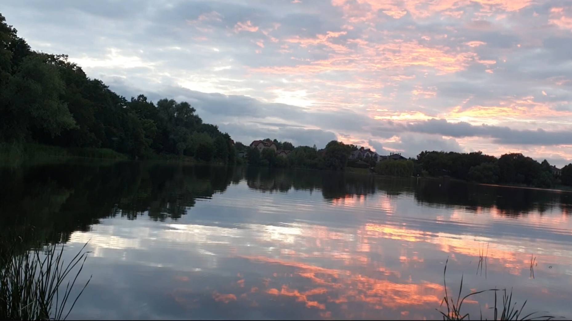 Закат на озере! Красота! Оранжевые лучи солнца 🌞 отражающиеся в озере. Вокруг деревья, природа.