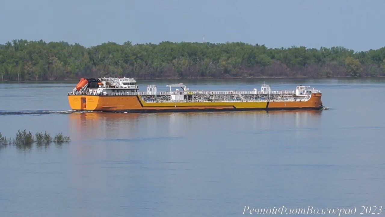 Теплоход танкер-химовоз АУРА идет вниз по Волге и затем в Волго-Донской судоходный канал им.Ленина.