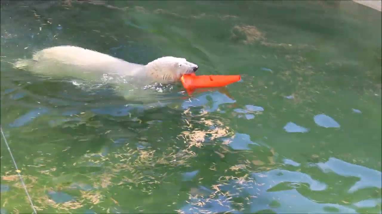 Белая медведица Стрелка отмылась в воде, а Белка так и осталась чумазая