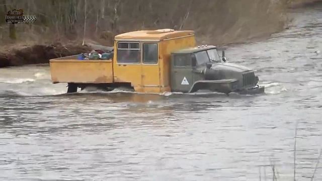 Полу грузовик, полу автобус, грузовик Урал через реку.