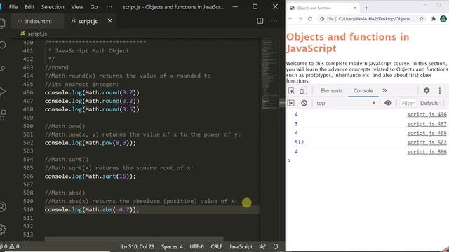 The JavaScript Math object allows you to perform mathematical tasks on numbers. Unlike other global objects, the Math object has no constructor. Methods and properties are static. All methods and properties (constants) can be used without creating a Math object first. In this lecture, you will learn about Math object in JavaScript and its methods and properties.