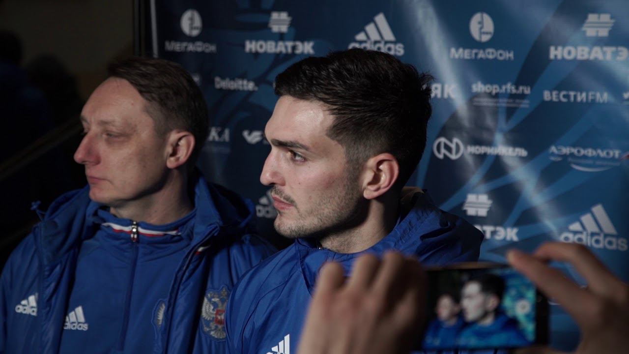 Полузащитник сборной России отвечает на вопросы журналистов после тренировки в Новогорске.