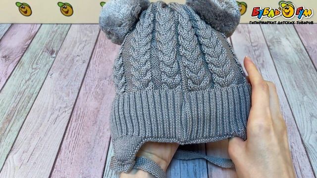 320688 Шапка для мальчика утепленная с помпонами в нежном сером цвете
