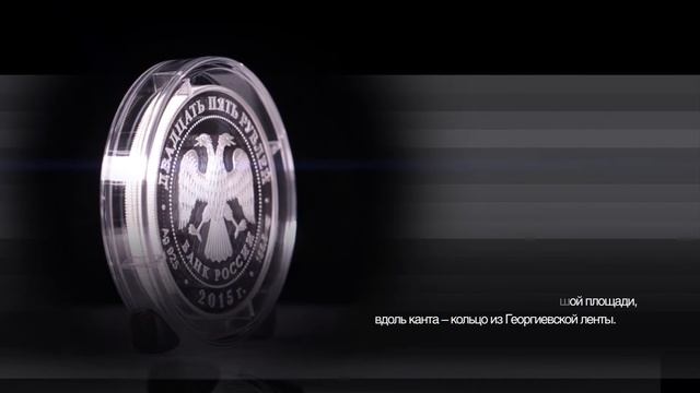 Банк России 26 марта 2015 года выпустил в обращение памятную монету из драгоценного металла номиналом 25 рублей серии «70-летие Победы советского народа в Великой Отечественной войне 1941-1945 гг.» На лицевой стороне монет в круге, обрамленном бусовым ободком, расположено рельефное изображение эмблемы Банка России — двуглавого орла с опущенными крыльями, под ним надпись полукругом «БАНК РОССИИ», а также по окружности имеются надписи, разделенные точками: номинал монет — «ДВАДЦАТЬ ПЯТЬ РУБЛЕЙ» и дата — «2015 г.», между ними проставлены обозначение металла по Периодической системе элементов Д.И. Менделеева, проба сплава, товарный знак Санкт-Петербургского монетного двора и масса драгоценного металла в чистоте. На оборотной стороне монеты (каталожный № 5115-0107) расположены в обрамлении георгиевской ленты рельефные изображения: в центре — Ордена Отечественной войны с исходящими лучами прожекторов, вверху в центре — монумента «Воин-освободитель» мемориала в Трептов-парке в Берлине, слева — маршала Г.К. Жукова на Параде Победы на Красной площади 24 июня 1945 года, справа — фрагмента плаката «Родина-мать зовет!», внизу слева — солдата, делающего надпись на стене Рейхстага, справа — скульптуры «Стоять насмерть!» на фоне главного монумента «Родина-мать зовет!» мемориального комплекса «Героям Сталинградской битвы» на Мамаевом кургане в Волгограде, вверху имеется надпись в две строки — «70 ЛЕТ ПОБЕДЫ»; Номинал 25 рублей Качество пруф Металл, проба серебро 925/1000 Масса общая, г 169,00 (±0,85) Содержание химически чистого металла не менее, г 155,50 Диаметр, мм 60,00 (±0,50) Толщина, мм 6,60 (±0,50) Тираж, шт. 1000 Дата выпуска: 26.03.2015 Каталожный номер: 5115-0107 Художник: А.А. Брынза. Скульптор: Ф.С. Андронов. Чеканка: Санкт-Петербургский монетный двор (СПМД). Оформление гурта: 252 рифления. http://www.cbr.ru/Bank-notes_coins/Base_of_memorable_coins/ShowCoins.aspx?cat_num=5115-0107
