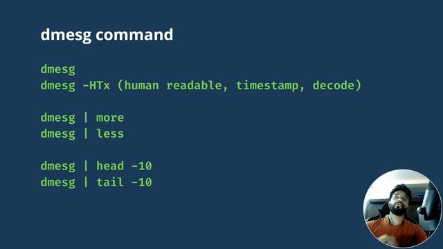 #linux #mprashant #linuxsystemmonitoring Linux DMESG Command Tutorial in Hindi | Linux System Monitoring Commands | MPrashant Hello dosto, In this video I have covered about some Linux System Monitoring Commands like Dmesg using these commands we can monitor the Linux system and it's hardware related issues including memory, harddisk, drivers related messages. 00:00 Intro 01:40 Dmesg Command Syntax 02:19 Linux du command 07:00 Demsg Live Monitoring 07:25 Dmesg -w Example What is Dmesg Command In Linux? Linux utility that displays kernel-related messages retrieved from the kernel ring buffer. The ring buffer stores information about hardware, device driver initialization, and messages from kernel modules that take place during system startup. dmesg command dmesg dmesg -HTx (human readable, timestamp, decode) dmesg | more dmesg | less dmesg | head -10 dmesg | tail -10 dmesg command dmesg | grep search_string You can search related to memory usb sda ----------------------------------------------------------------------------- dmesg kernel ring buffer linux Linux dmesg what is Linux Dmesg command Dmesg command in hindi Linux System monitoring commands linux system monitoring dmesg -w example of dmesg how to use dmesg dmesg in Linux dmesg tutorial Linux tutorial in Hindi linux tutorial for beginners demsg in hindi mprashant what is kernel ring buffer ring buffer do dmesg -HTx dmesg error what is dmesg how to use dmesg command in linux ram tty error dmesg command For live monitoring dmesg -w To clear the ring buffer dmesg -c To filter the messages based on different level dmesg -l emerg/alert/crit/err/warn/notice/info/debug