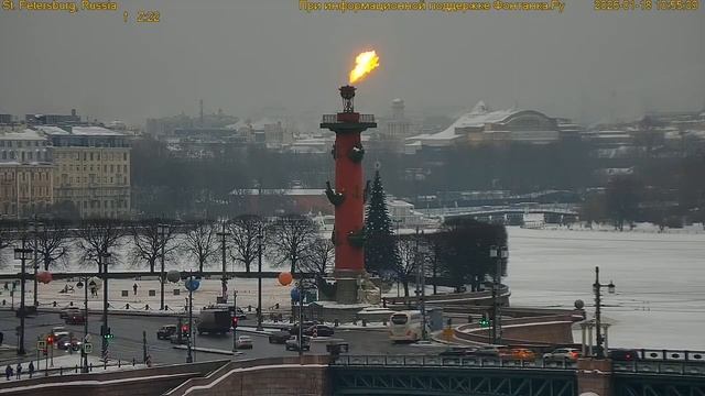 Факелы Ростральных колонн зажгли воскресным утром в честь годовщины прорыва блокады Ленинграда