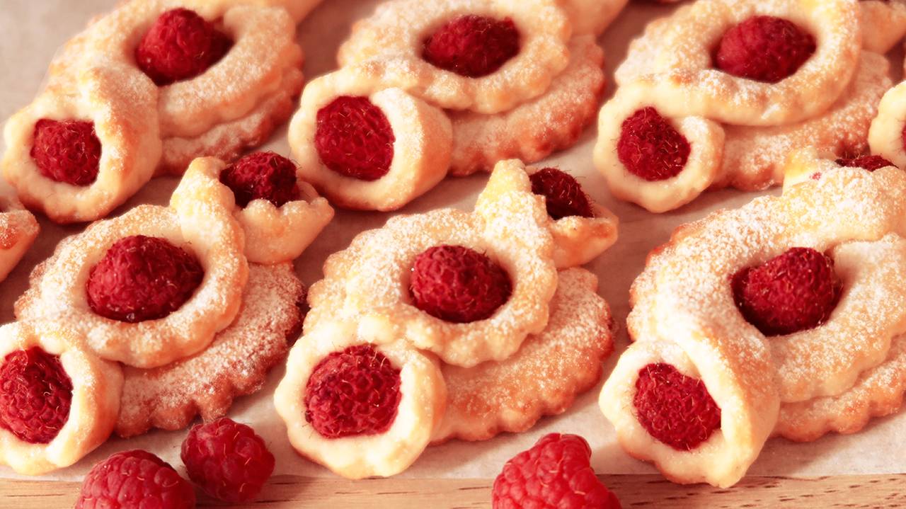 Ингредиенты: ~ на 24 шт Мука ~ 320-330 г, Молоко 50 мл, Сливочное масло 100 г, Яйцо 1 шт, Сахар 100 г, Разрыхлитель 1,5 ч.л, Ванильный сахар 8 г, Соль по вкусу, Малина 72 шт ~ 200 г Для смазки: Желток 1 шт Молоко 1 ч.л Выпекать при 180 ° ~ 15 минут. Время выпечки и температура зависят от особенностей духовки