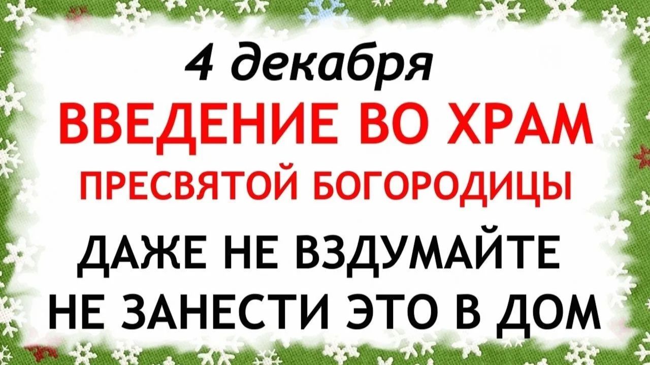 4 декабря - Введение во храм Пресвятой Богородицы. Что нельзя делать на Введение 4 декабря. Народные традиции и приметы и суеверия. 4 декабря 2025 года церковь отмечает большой праздник — Введение во храм Пресвятой Богородицы. В этом видео вы узнаете что нельзя делать Введение, народные приметы на Введение 2023. Что можно делать на Введение согласно народным и церковным традициям, какой православный праздник 4 декаября, обычаи, обряды, поверья и запреты, молитвы на Введение во храм. И как нужно вести себя, согласно народным традициям на Введение, чтобы привлечь удачу в свою жизнь.