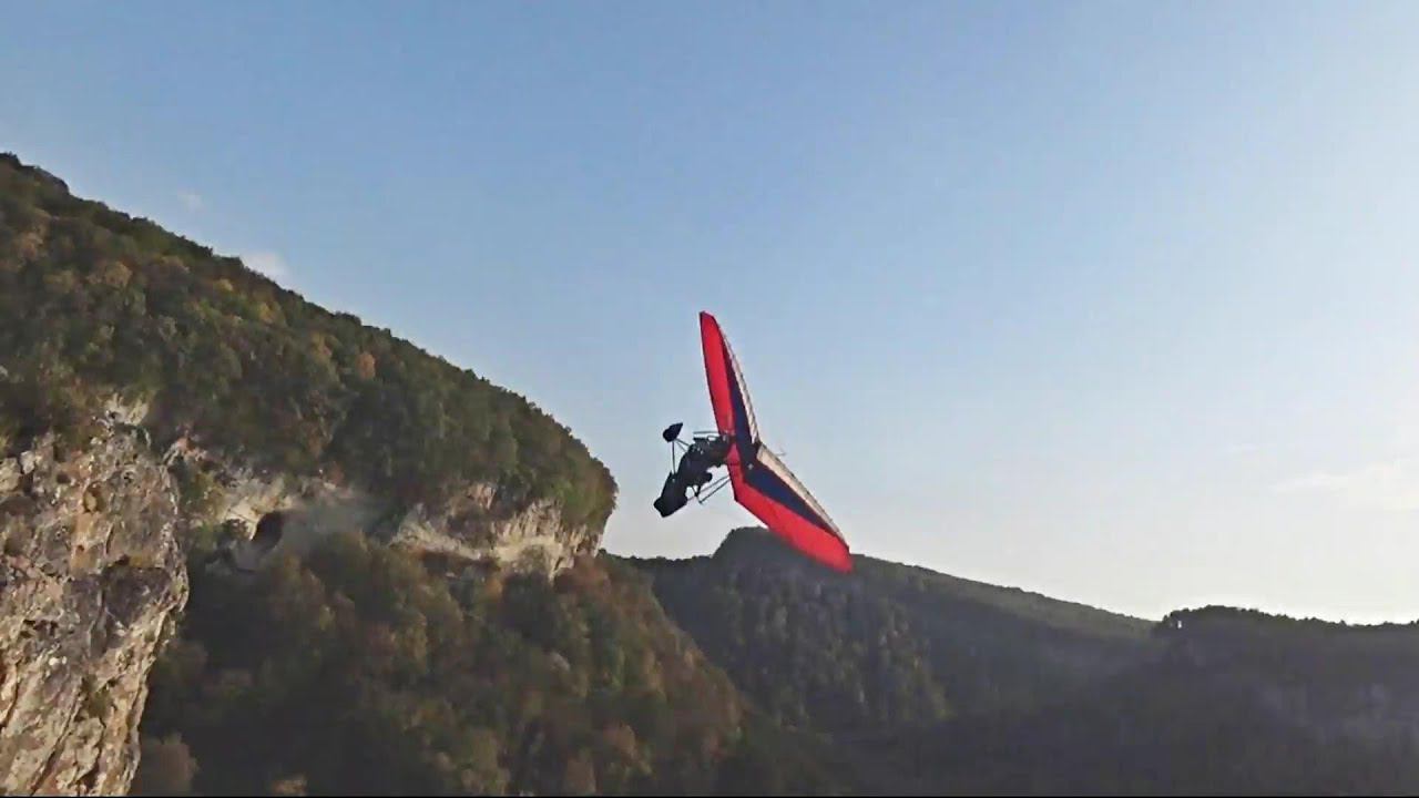Впечатляюще опасные манёвры мотодельтаплана в Адыгее над видовой площадкой ущелья Мишоко и каньоном реки Белой