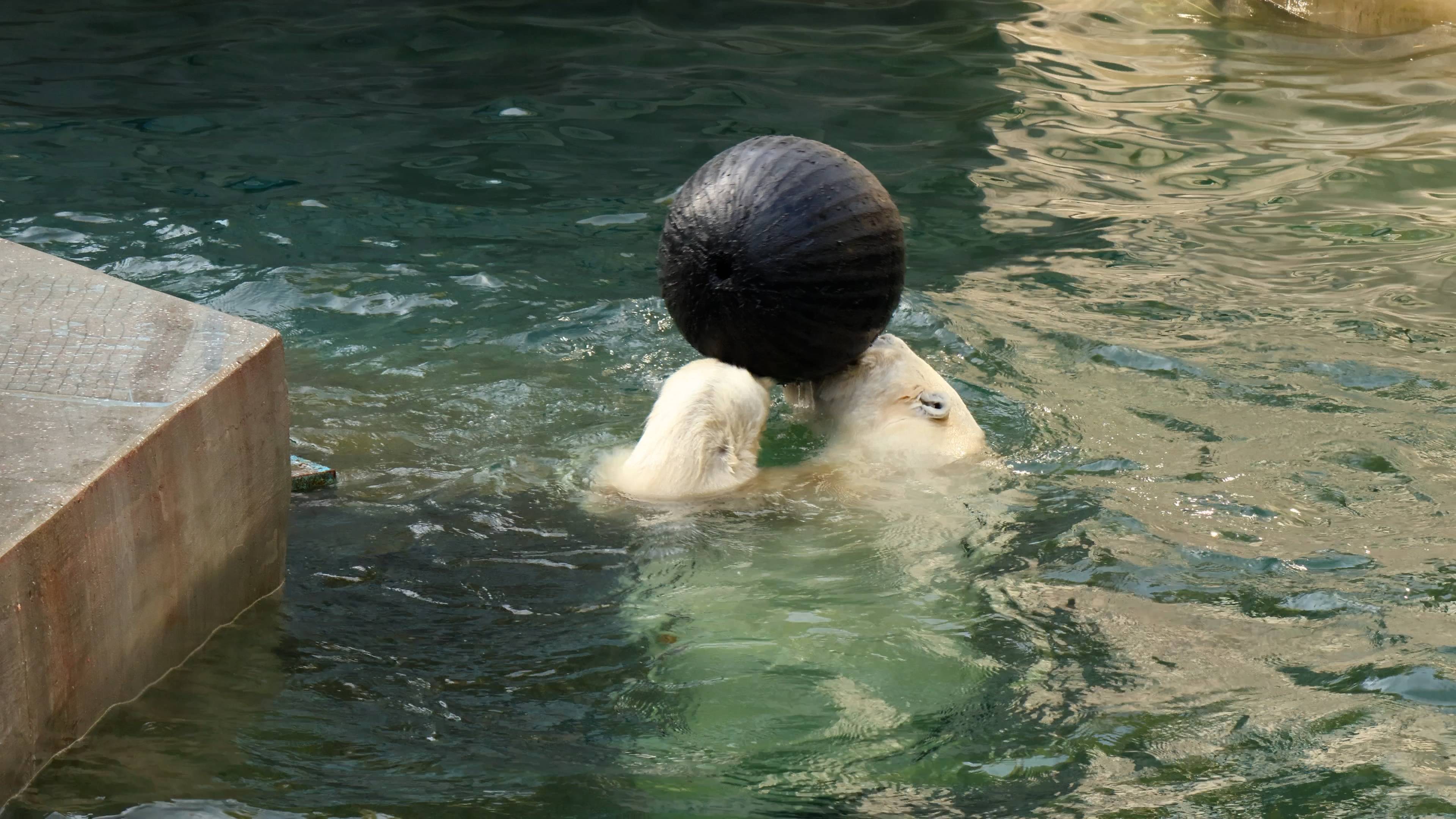 Белый медведь Кай играет с шаром