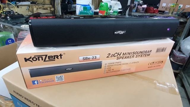 Brand: Konzert Model: SBx23 Type: Mini Soundbar Power: 1000w PMPO Inputs: Usb Sd Bt Aux Battery: Rechargeable 5v Srp: P1,999.00