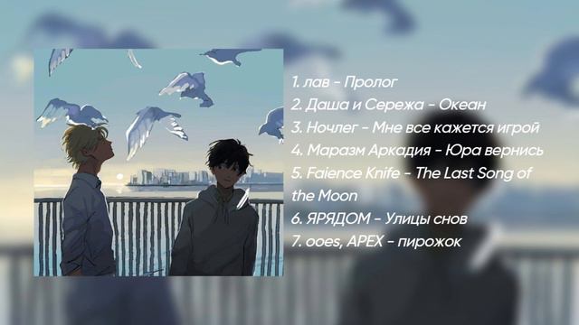 ₊ ˚ ⊹ ♡ Таймкоды ♡ ⊹ ˚ ₊ 1. лав - Пролог 00:00-2:26 2. Даша и Сережа - Океан 2:26-05:03 3. Ночлег - Мне все кажется игрой 05:03-09:15 4. Маразм Аркадия - Юра вернись 09:15-12:44 5. Faience Knife - The Last Song of the Moon 12:44-16:46 6. ЯРЯДОМ - Улицы снов 16:46-21:52 7. ooes, APEX - пирожок 21:52-24:49 ___________________________________________________________________________ «Побудь со мной... Необязательно навеки. Хотя бы сейчас.» • • • Anime: Банановая рыба (Banana Fish)