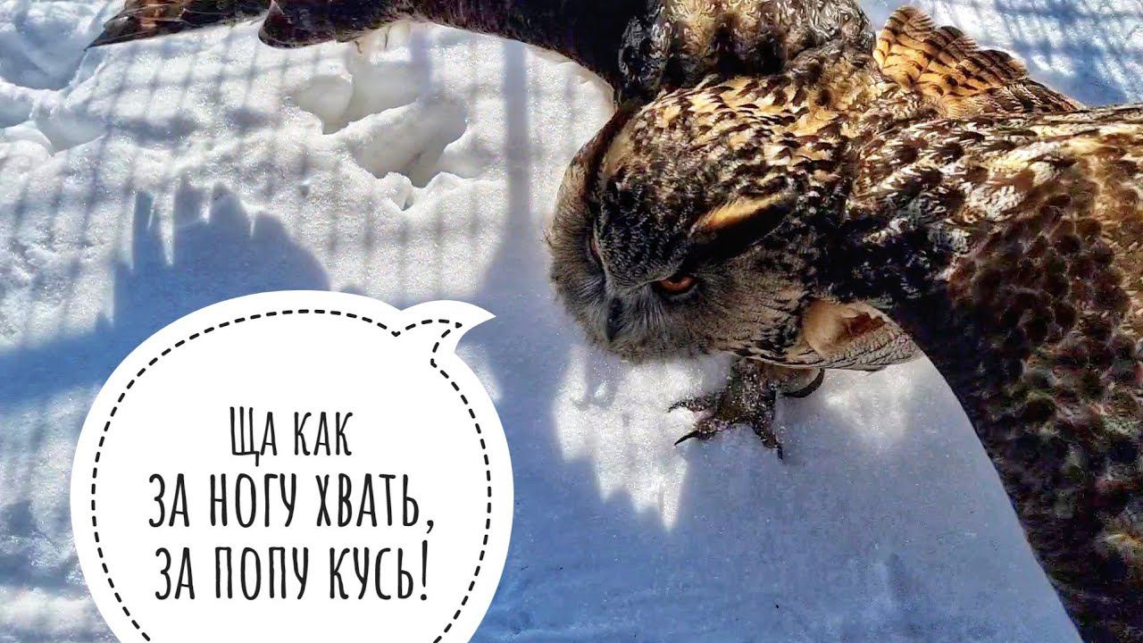 Сова филин Ёль решила немножко выгнать меня из вольера. Сыч Лучик гуляет на морозе