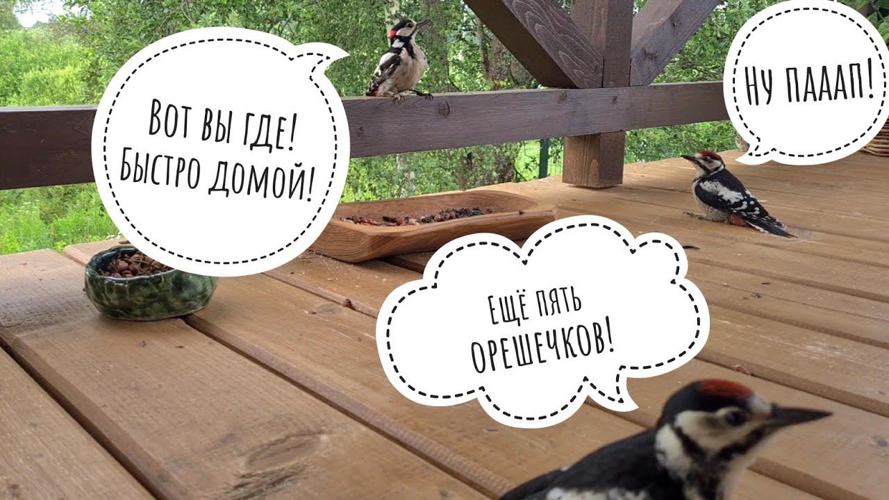 Примерно месяц тазик с орешками стоял один одинёшенек и не интересовал птиц. И тут одновременно привели своих детей Большие пёстрые дятлы и дубоносы. А за ними подтянулись зеленушки и воробьи. Вся эта команда завтракает у нас на веранде арахисом и пропадает до следующего дня, только дятлы возвращаются ещё и вечером. У молодых больших пёстрых дятлов на головах есть красные шапочки. У взврослых самок красного на голове нет вообще, а у взрослых самцов остаётся красным только затылок. Поэтому, легко понять, кто там дети, а кто родители. #owlhouse #viral #birds