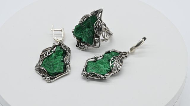 •Авторское украшение ручной работы. Камни установлены в оправу из ювелирного сплава - нейзильбер. •Форма и рисунок камня никогда не повторяются, что делает данное изделие единственным в своем роде. •Габарит кольца 26*35мм, серьги: 25*42мм., вес 18,3 г •Швензы изготовлены из серебра проба отсутствует. •Указаны габариты серьги без швензы. Цена: 15 793 руб. https://radugakamnya.ru/catalog/ukrasheniya_iz_kamnya_po_tipam/koltso_i_sergi_1/koltso_i_sergi_plisovyy_malakhit_razmer_18-549876/