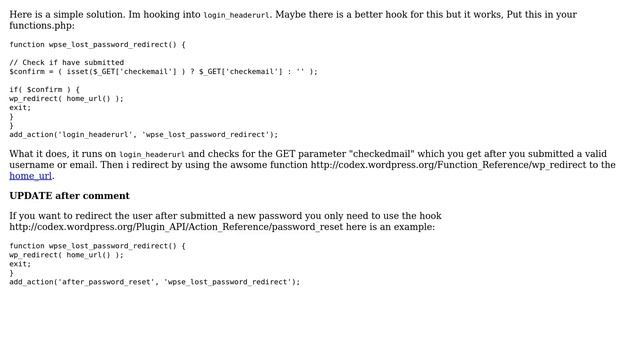 Wordpress: wordpress redirect after password reset Helpful? Please support me on Patreon: https://www.patreon.com/roelvandepaar With thanks & praise to God, and with thanks to the many people who have made this project possible! | Content (except music & images) licensed under cc by-sa 3.0 | Music: https://www.bensound.com/royalty-free-music | Images: https://stocksnap.io/license & others | With thanks to user Schurik (https://wordpress.stackexchange.com/users/80177), user rsigg (https://wordpress.stackexchange.com/users/8052), user r00tAcc3ss (https://wordpress.stackexchange.com/users/13405), user Pontus Abrahamsson (https://wordpress.stackexchange.com/users/16722), user Joshc (https://wordpress.stackexchange.com/users/11327), user bobbingwide (https://wordpress.stackexchange.com/users/77573), and the Stack Exchange Network (http://wordpress.stackexchange.com/questions/82955). Trademarks are property of their respective owners. Disclaimer: All information is provided "AS IS" without warranty of any kind. You are responsible for your own actions. Please contact me if anything is amiss at Roel D.OT VandePaar A.T gmail.com.
