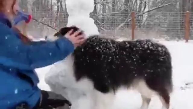 Девушке повезло с помощником!Вместе у них получился замечательный снеговик