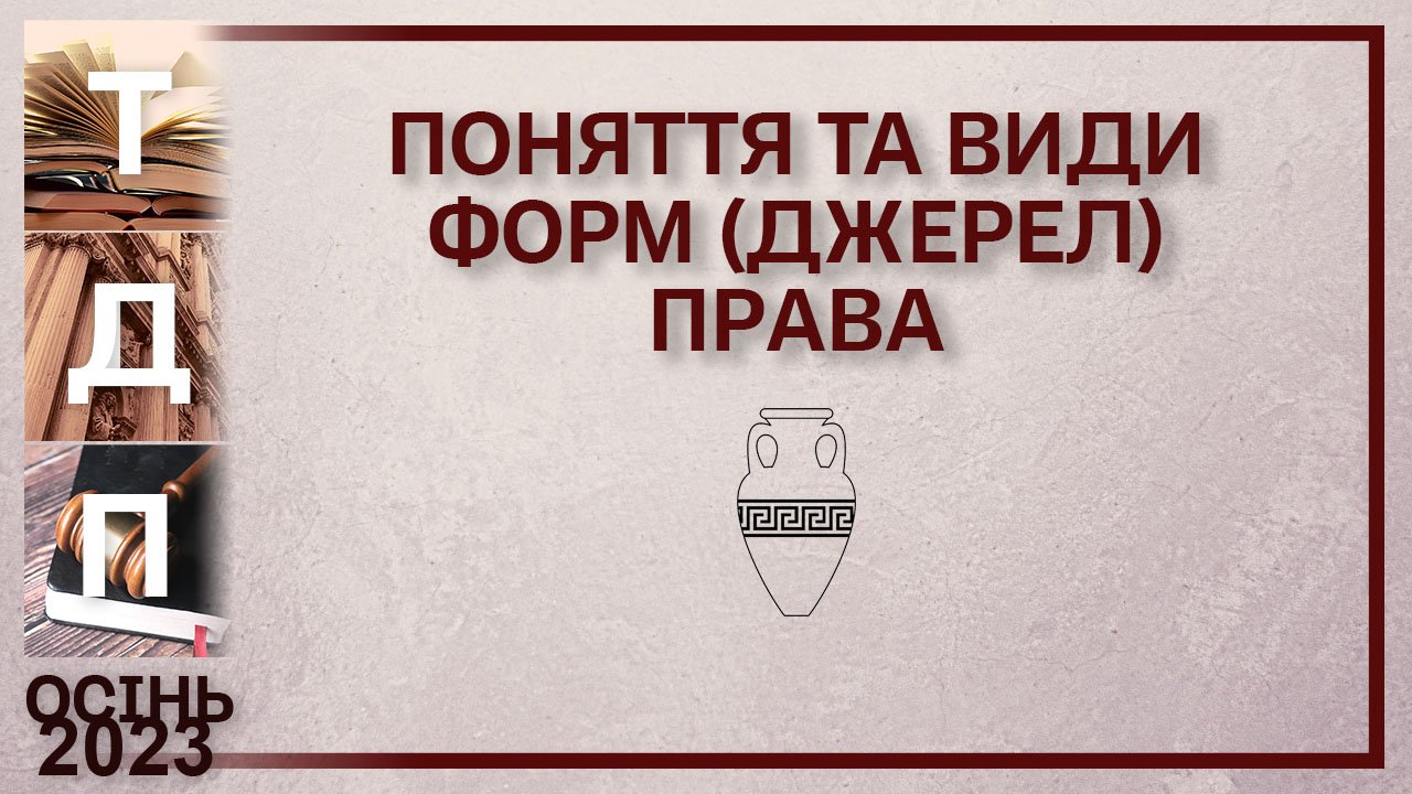 Інтернет-ресурси з дисципліни "Теорія держави та права (ТДП)": Група Теорія держави і права (ТДП) https://vk.com/theoryofstateandlaw Група Теорія держави та права (ТДП) Телеграм https://t.me/theoryofstateandlawtgp Індивідуальні консультації з дисципліни "Теорія держави і права (ТДП)" https://docs.google.com/document/d/1MTGZ8hYzQRqeRNrYTBW52hzVM7VbNsoDJxY5NT80bIE/edit 1. Поняття та види форм (джерел) права Форми (джерела) права розуміються у двох сенсах. Як способи закріплення та зовнішнього вираження правових норм (закон, підзаконні акти) і як те, звідки онтологічно походить право (воля народу, воля правлячих еліт тощо). Класифікуючи форми права, слід зазначити такі види: 1. Усні – правила, закладені у свідомості людей автоматичному режимі (правовий звичай, принципи, аксіоми права – очевидні базові правила, які потребують закріплення для своєї легітимності). 2. Письмові - які мають ознакою формальної визначеності які, у свою чергу, діляться на два види: нагоди і постійні. Норми до випадку (лат. ad hoс – створення норми під певну подію) діляться на: прецедент (лат. praecedens – попереду, що йде попереду), рішення правозастосовного органу у справі, обґрунтування якого використовується згодом при вирішенні аналогічних справ органами рівного або нижчестоящого рівня; тобто при збігу фактичних обставин йде посилання на описану раніше справу), доктрину (тексти авторитетних учених) та нормативний договір. Постійні норми (закон (нормативно-правовий акт)) – розраховані на невизначене коло суб'єктів та ситуацій.
