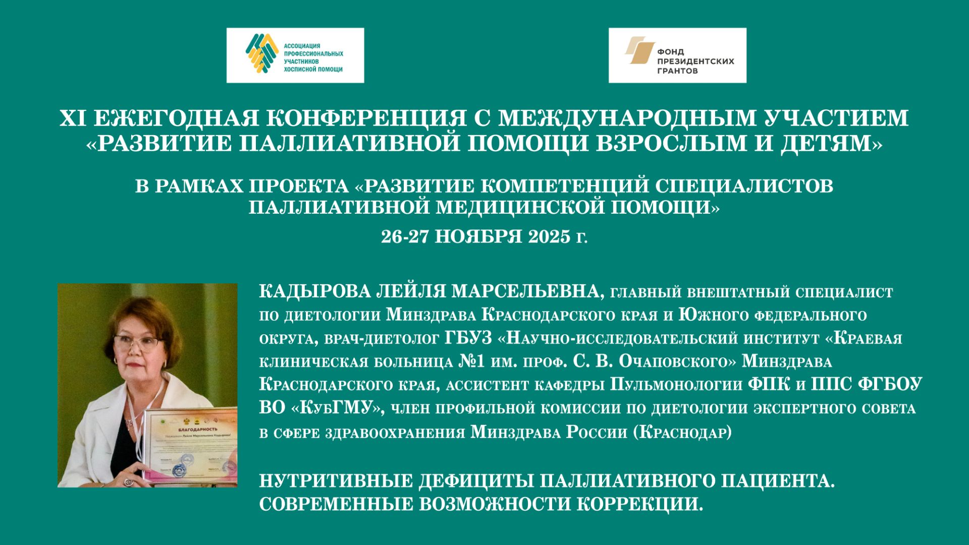 ► Доклад «Нутритивные дефициты паллиативного пациента. Современные возможности коррекции» ߷ Кадырова Лейля Марсельевна, главный внештатный специалист по диетологии Минздрава Краснодарского края и Южного федерального округа, врач-диетолог ГБУЗ «Научно-исследовательский институт «Краевая клиническая больница №1 им. проф. С. В. Очаповского» Минздрава Краснодарского края, ассистент кафедры Пульмонологии ФПК и ППС ФГБОУ ВО «КубГМУ», член профильной комиссии по диетологии экспертного совета в сфере здравоохранения Минздрава России (Краснодар) ⚑ XI Ежегодная конференция с международным участием «Развитие паллиативной помощи взрослым и детям» 26-27 ноября 2025 года