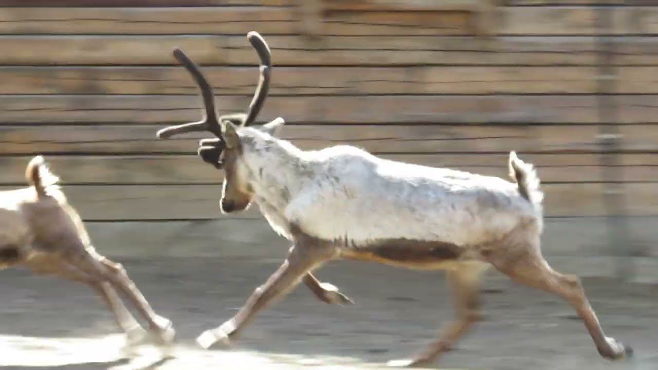 Северный олень бегает по вольеру 10.05.2023