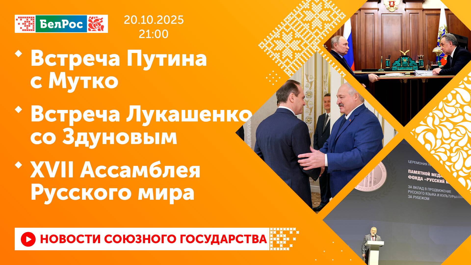 Закадровый текст озвучивает *ИИ Антон* Новости 20.10.2025 на 21:00 - Владимир Путин провёл встречу с главой ДОМ.РФ Виталием Мутко. - Александр Лукашенко провёл встречу с главой Мордовии. - Представители более чем 100 стран собрались на ежегодном гуманитарном форуме в Москве. Смотрите главные новости Союзного государства на телеканале БелРос. Ссылки на наши соц. сети Сайт: http://belros.tv/ Telegram: https://t.me/belrostv Одноклассники: https://ok.ru/group/55657426976918 ВКонтакте: https://vk.com/belrostv TikTok: https://www.tiktok.com/@belros_tv?_t=... RuTube: https://rutube.ru/channel/23501830/ Яндекс. Дзен: https://zen.yandex.ru/belrostvv Наши подкасты на Яндекс. Музыке: https://music.yandex.ru/album/25615251 #главныеновости #новостисегодня #СоюзноеГосударство