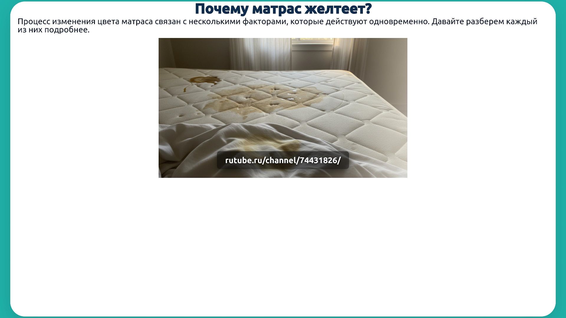 Почему матрас желтеет? Многие спокойно спят на матрасе годами, не подозревая, что прямо под спиной происходит настоящая химическая война. Каждый ночной пот, каждое капелька кожного сала, каждый луч солнца, проникающий в спальню, — это не просто бытовые мелочи. Это триггеры, которые запускают цепь реакций, превращая белоснежный матрас в пожелтевшую поверхность, скрытую от глаз, но опасную для здоровья. Вы когда-нибудь задумывались, почему пятна появляются именно в тех местах, где вы чаще всего ложитесь? Или почему через несколько лет даже самый дорогой матрас начинает издавать неприятный запах? Дело в том, что внутри волокон и пор матраса скрыты миллиарды микроорганизмов, которые питаются вашими выделениями, а атмосферный кислород постепенно «сжигает» синтетические материалы. Но это лишь начало. Скрытые угрозы прячутся даже в самых обычных вещах: чашка кофе, случайно пролитая на ночь, или мочь ребенка, оставшаяся незамеченной. Эти «невинные» капли становятся катализаторами, ускоряющими старение наполнителя. А избыточная влажность в спальне? Это идеальная среда для грибков, которые не только портят цвет, но и выделяют токсины, от которых страдает ваш сон и иммунитет. Почему же проблема желтения матраса редко становится темой разговоров? Потому что большинство считает это «нормальным старением». Но правда в том, что это сигнал: ваш матрас может стать источником аллергии, раздражения кожи и даже ухудшения самочувствия. В этом видео мы разоблачим все мифы, покажем, как обычные привычки ускоряют деградацию матраса, и расскажем о простых, но эффективных способах защиты. Узнайте, какие материалы наиболее уязвимы, как предотвратить необратимые изменения и сохранить не только внешний вид, но и гигиену вашего спального места. Не упустите шанс узнать то, что производители часто умалчивают! Как предотвратить пожелтение матраса? Узнайте, как защитить свой матрас от необратимых изменений и сохранить его гигиену и внешний вид на долгое время! https://rutube.ru/video/c6c880ab1976e317c0a019bf4c837311/