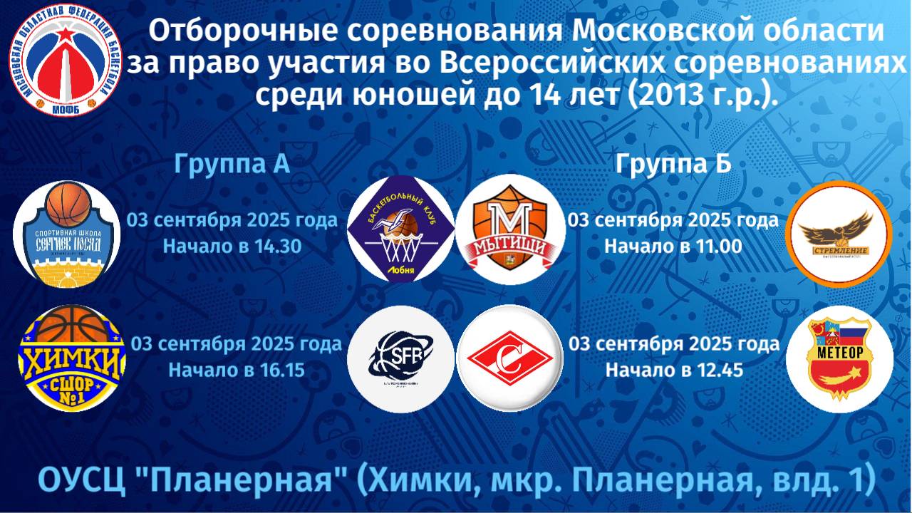 11:00 Мытищи-БК "Стремление" 12:45 Люберцы-Балашиха 14:30 Сергиев Посад-Лобня 16:15 Химки-АНО "СФБ"