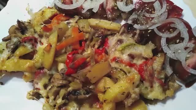 ШАМПИНЬОНЫ С КАРТОШКОЙ И ОВОЩАМИ ПОД СЫРНОЙ КОРОЧКОЙ В ДУХОВКЕ.