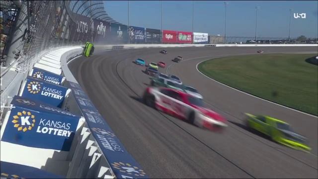 Гонщик NASCAR эпично проехал по стене на скорости 320 км/ч . Болид Зейна Смита оказался зажат между другой машиной и стеной, машина перевернулась на бок и проскользила вдоль стены. Никто не пострадал.