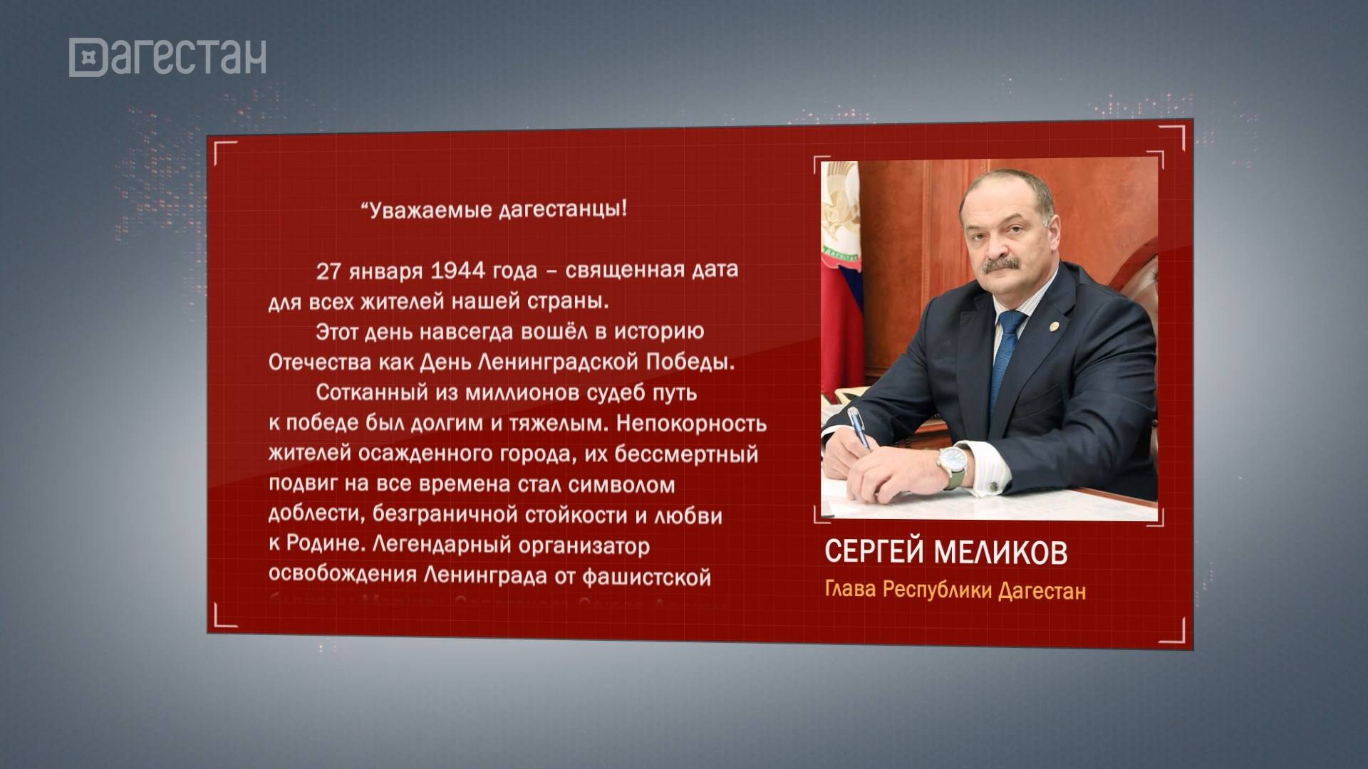 Вся страна сегодня вспоминает бессмертный подвиг жителей и защитников Ленинграда в годы Великой Отечественной войны. Это День полного снятия блокады города. Путь к победе был долгим и тяжелым. Голод, холод, постоянные обстрелы и бомбежки. И так почти 900 дней. Непокорность жителей осажденного города, их бессмертный подвиг на все времена стал символом доблести, безграничной стойкости и любви к Родине. К жителям Дагестана обратился глава республики Сергей Меликов.