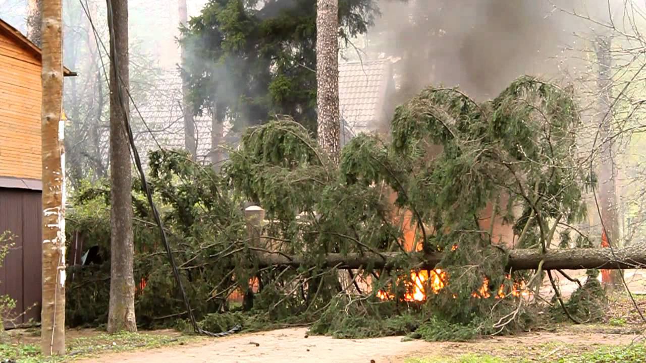 Встреча стихий: ветер, дерево, электричество, огонь. Были ещё масло из трансформатора, на который упало дерево и вода, которой пытались тушить масло, отчего оно вспыхнуло сильнее...