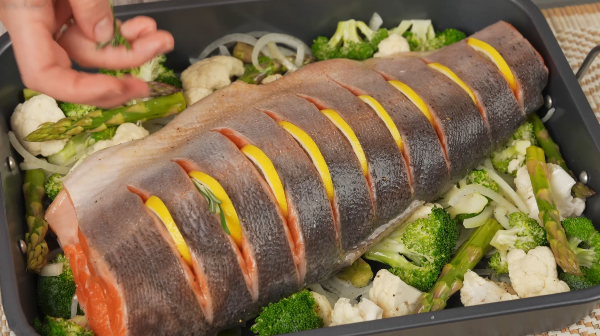 Запеченная форель в духовке – восхитительное блюдо для праздничного стола. Это настоящий деликатес, который просто тает во рту. Привет, дорогие гурманы! Сегодня у нас на кулинарном канале необычайно вкусный рецепт — запеченная форель с брокколи и цветной капустой! Этот рецепт точно станет вашим фаворитом, ведь он не только легок в приготовлении, но и поражает своим невероятным вкусом. Мы возьмем свежую форель, нежно приправим ее избранными специями, а затем запечем в духовке до золотистой корочки. Аромат, который наполняет кухню в процессе готовки, просто завораживает! Секрет этого блюда - сочетание форели с питательным брокколи и цветной капустой. Они придают блюду не только уникальный вкус, но и делают его полезным для вашего организма. Не нужно быть профессиональным поваром, чтобы приготовить этот шедевр. Следуйте нашим шаг за шагом инструкциям, и вы удивитесь, насколько легко создать это великолепное блюдо. Так что, если вы любите рыбу и хотите порадовать себя и своих близких чем-то особенным, этот рецепт — именно то, что вам нужно! Приготовьте вкусную рыбу, оставьте свои впечатления в комментариях и не забудьте подписаться на наш канал для еще больше кулинарных открытий. Приятного аппетита! Ингредиенты: Форель ~ 2 кг Соевый соус – 100 мл. Оливковое масло – 50 мл. Мед – 50 мл. Черный перец, соль, розмарин. Лимонный сок Лук - 2 шт. Брокколи – 300 г Цветная капуста – 300 г Спаржа Лимон – 1 шт. 4 зубчика чеснока Розмари Помидоры черри – 150 г. Вино белое сухое – 100 мл. Вяленые помидоры – 100г. Густые сливки – 300 мл. Сыр Пармезан – 70 г Оливковое масло Сливочное масло форель в духовке, форель в духовке рецепты, форель запеченная в духовке, как приготовить форель в духовке, сочная форель в духовке,