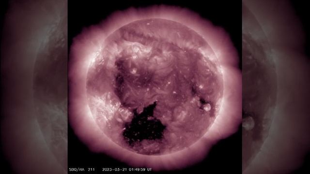 A massive coronal hole on the Sun is headed towards Earth, and it has the potential to cause a G2-class geomagnetic storm. According to NOAA forecasters, the storm is expected to hit Earth on March 24th, which means we could see auroras as far south as New York and Idaho. Captured using the AIA 0211. This channel (as well as AIA 335) highlights the active region of the outer atmosphere of the Sun - the corona. Active regions, solar flares, and coronal mass ejections will appear bright here. The dark areas - called coronal holes - are places where very little radiation is emitted, yet are the main source of solar wind particles. This coronal hole is not actually a hole, but rather a spot on the Sun that appears dark because it's cooler than the rest of the Sun. This one is particularly huge and could cause rapid solar winds, which can reach speeds of up to 800 km per second. This phenomenon is caused by rapid solar winds released by the dark spot on the sun's corona. While relatively mild compared to solar flares, this storm has the potential to disrupt some things on Earth and produce a more vibrant aurora borealis. In this video, we'll show you the latest NASA/SDO footage of the coronal hole and explain what it means for us here on Earth. Don't miss this breaking news event! Don't miss out on the chance to witness this natural phenomenon in person or capture stunning photos of the aurora borealis. Subscribe to our channel for more updates on space news and events. Courtesy of NASA/SDO and the AIA, EVE, and HMI science teams. #breakingnews #solarexplosion #solaractivity #geomagneticstorm #NASA #SDO #space #science #astronomy #solarsystem #sun #earth #spaceweather #blackspotonsun #sunspot
