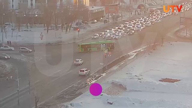 На перекрестке Гагарина и Мира сегодня утром произошло ДТП с участием зеленого автобуса. Из-за аварии образовалась пробка, автобус до сих пор находится на месте происшествия