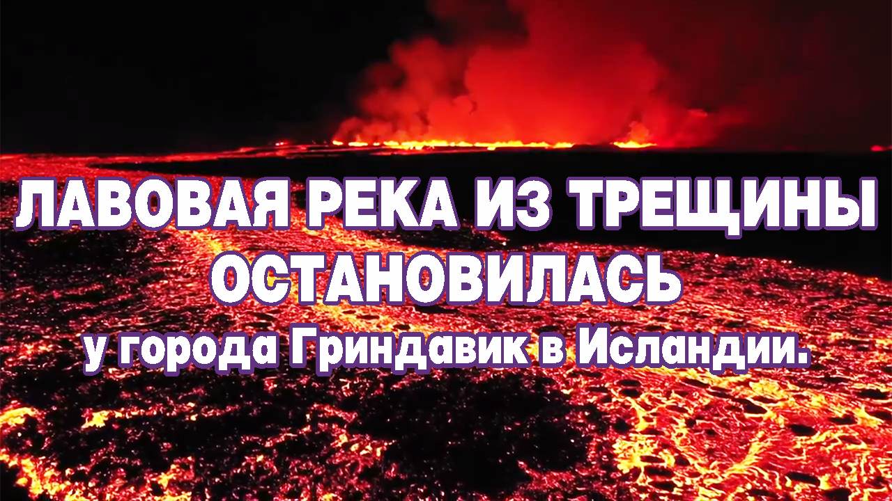Лавовая река из трещины остановилась у г. Гриндавик в Исландии.