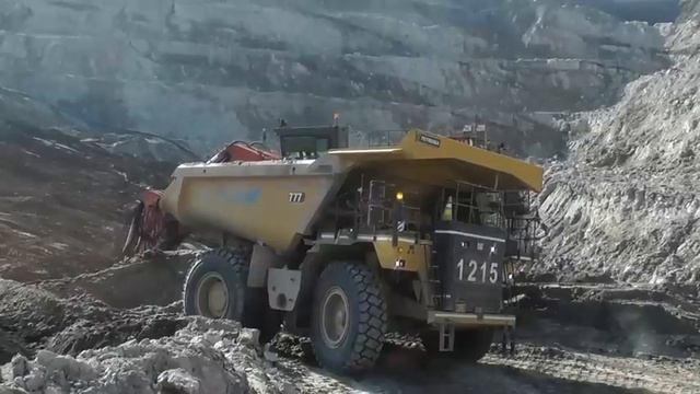 Бульдозер D8R поддерживает экскаватор Hitachi EX2600, загружающий вскрышные породы в самосвалы