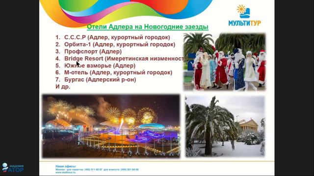 ВЕБИНАР|МУЛЬТИТУР| Новогодние и рождественские туры|Краснодарский край 🔔Подписывайтесь на наш канал и следите за обновлениями в соц.сетях, будем выкладывать много интересных видео о местах, куда можно поехать: ►Телеграм: https://t.me/multitour_for_agent ►ВК: https://vk.com/multitur ►Дзен: https://dzen.ru/id/5d766a6baad43600ad.. ►OK: https://ok.ru/profile/572506334933 ----------------- Задавайте свои вопросы в комментариях! ----------------- Подробнее об условиях и ценах можно узнать на нашем сайте https://www.multitour.ru/ или по телефону ☎ +7 (499) 681-61-08