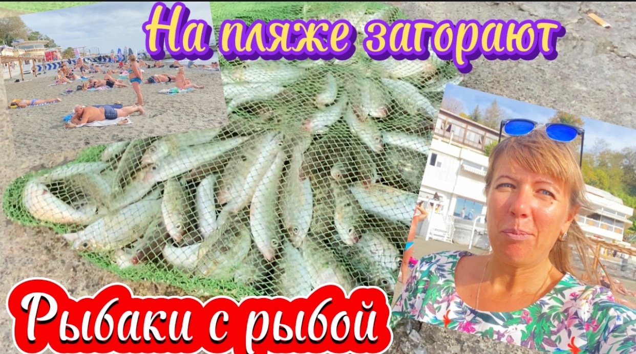 В Сочи большой улов рыбы. В море рыбак поймал много рыбы, а люди загорают