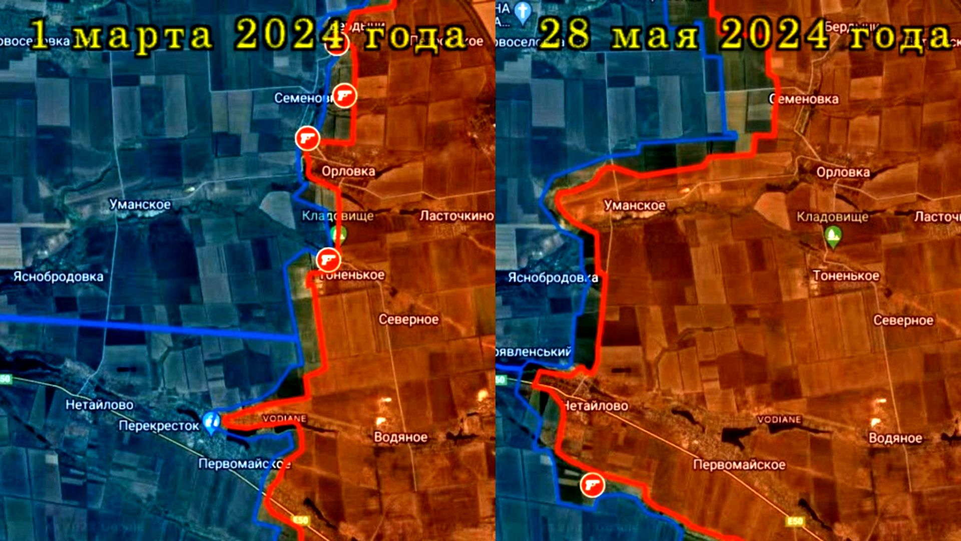 Анимированная карта боевых действий к западу от Авдеевки с март по май 2024 года