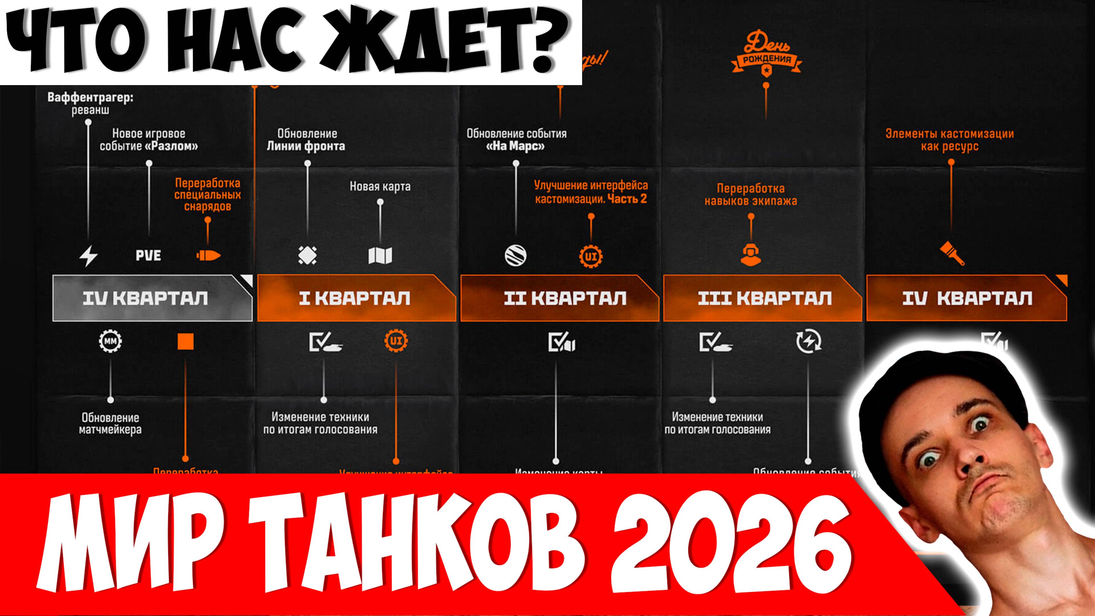 ✔️ Телеграм канал - https://t.me/vovakrasaba ✔️ Мой Дзен (статьи/видео) - https://dzen.ru/vovakrasabamirtankov ✔️ Стримы на ютуб - https://www.youtube.com/@vovakrasaba ✔️ Мой VKPlay - https://live.vkvideo.ru/vovakrasawa В этом ролике мы разберем Дорожную карту Мира танков на конец 2025 года и весь 2026 год. Будет очень много интересного, поэтому настоятельно рекомендую вам смотреть видео до конца. Разработчики хотят затронуть такие вещи, как: Событие Ваффентрагер, Событие "На Марс", Ребаланс танков, Ребаланс карт, изменение кастомизации техники и многое другое. Если ролик будет для вас полезен - буду рад лайку и подписке. Ну и не забывайте наливать чай/кофе перед просмотром.