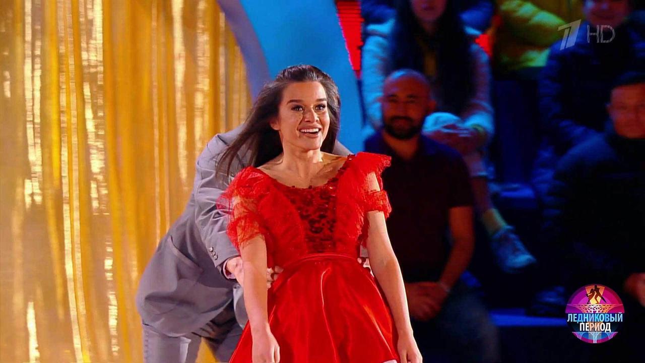 На льду — телеведущая Ксения Бородина и олимпийский чемпион Дмитрий Соловьев. Пара катается под композицию Максима Дунаевского из кинофильма «Карнавал».