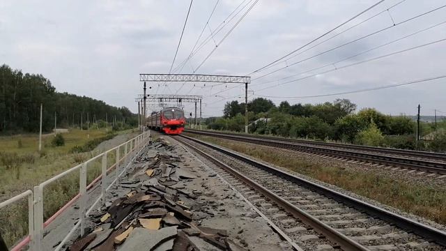 Электропоезд ЭД4М-0282 с пригородным поездом №6016 Миасс-1—Челябинск в 6-ти вагонной составности прибывает на о.п. Бутаки Дата: 03.08.2021