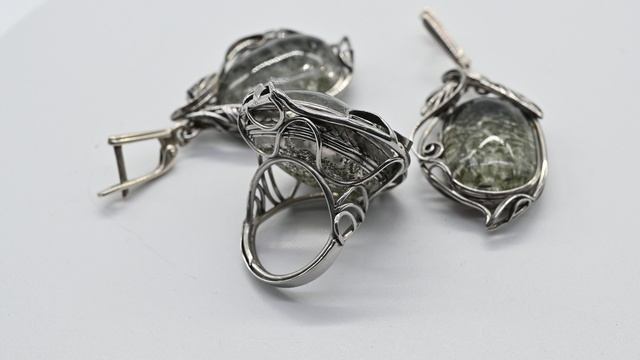•Авторское украшение ручной работы. Камни установлены в оправу из ювелирного сплава - нейзильбер. •Форма и рисунок камня никогда не повторяются, что делает данное изделие единственным в своем роде. •Габарит кольца 26*34мм, серьги 22*35мм. •Швензы изготовлены из серебра проба отсутствует.