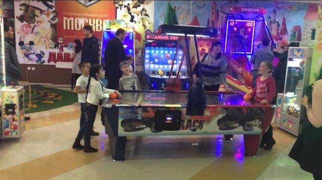 Маленькие дети играют на взрослом аэрохоккее в развлекательном центре компании Robotic Retailers Теги: Аэрохоккей,воздушный хоккей
