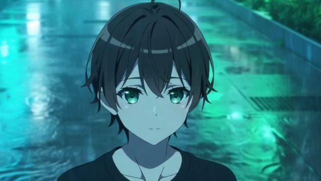 Аниме-персонаж: молодой человек с короткой чёрной причёской и изумрудными глазами, одиноко застыл под проливным дождём, окружённый ночными огнями мегаполиса, настроение — меланхоличное и напряжённое.