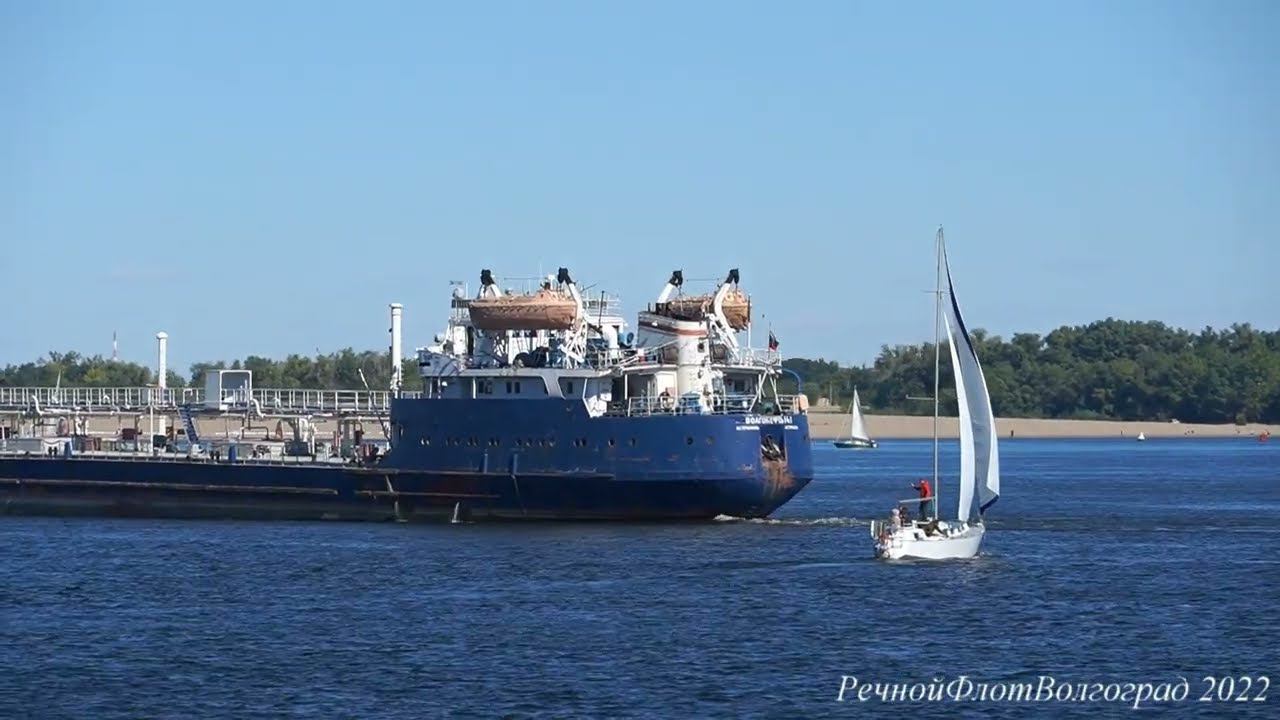 Теплоход Волгонефть 141 на Волге проходит центр Волгограда