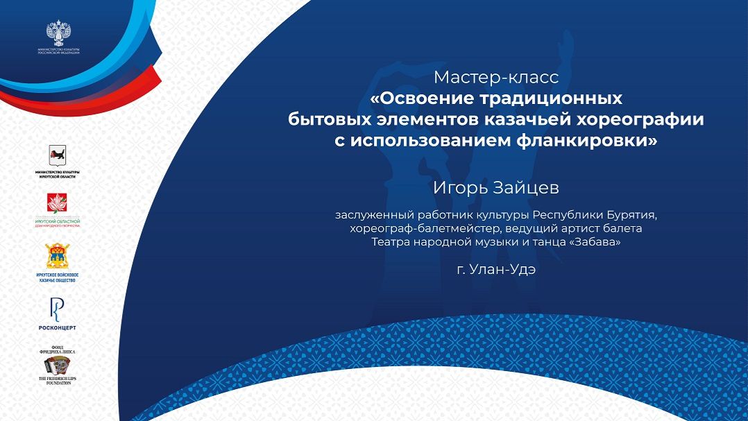 Мастер-класс для любительских хореографических коллективов и тех, кто увлекается фланкировкой. Проводит Игорь Зайцев – заслуженный работник культуры Республики Бурятия, хореограф-балетмейстер, ведущий артист балета Театра народной музыки и танца «Забава» (г. Улан-Удэ). Практическое занятие проводится в Иркутске с участниками регионального этапа всероссийского фольклорного конкурса «Казачий круг». Игорь Федорович делится собственным опытом работы с элементом традиционной культуры российского казачества – шашкой. Специалист даёт основы, присущие традиционной культуре сибирских казаков. С этим материалом далее смогут работать хореографы для постановки танцевальных композиций.