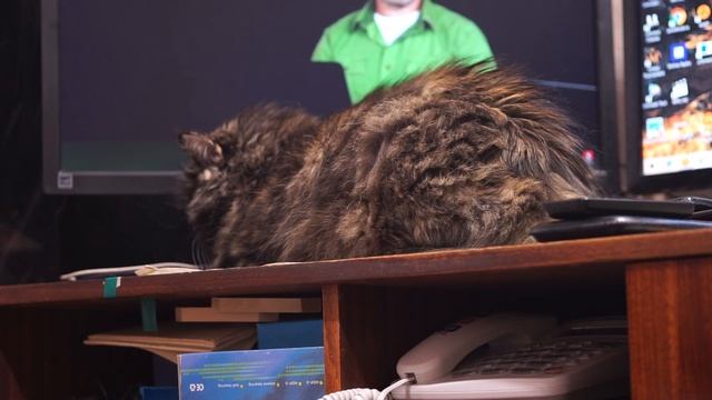 Кошка лежит отдыхает на моём рабочем столе с мониторами, FullHD, Часть C0018