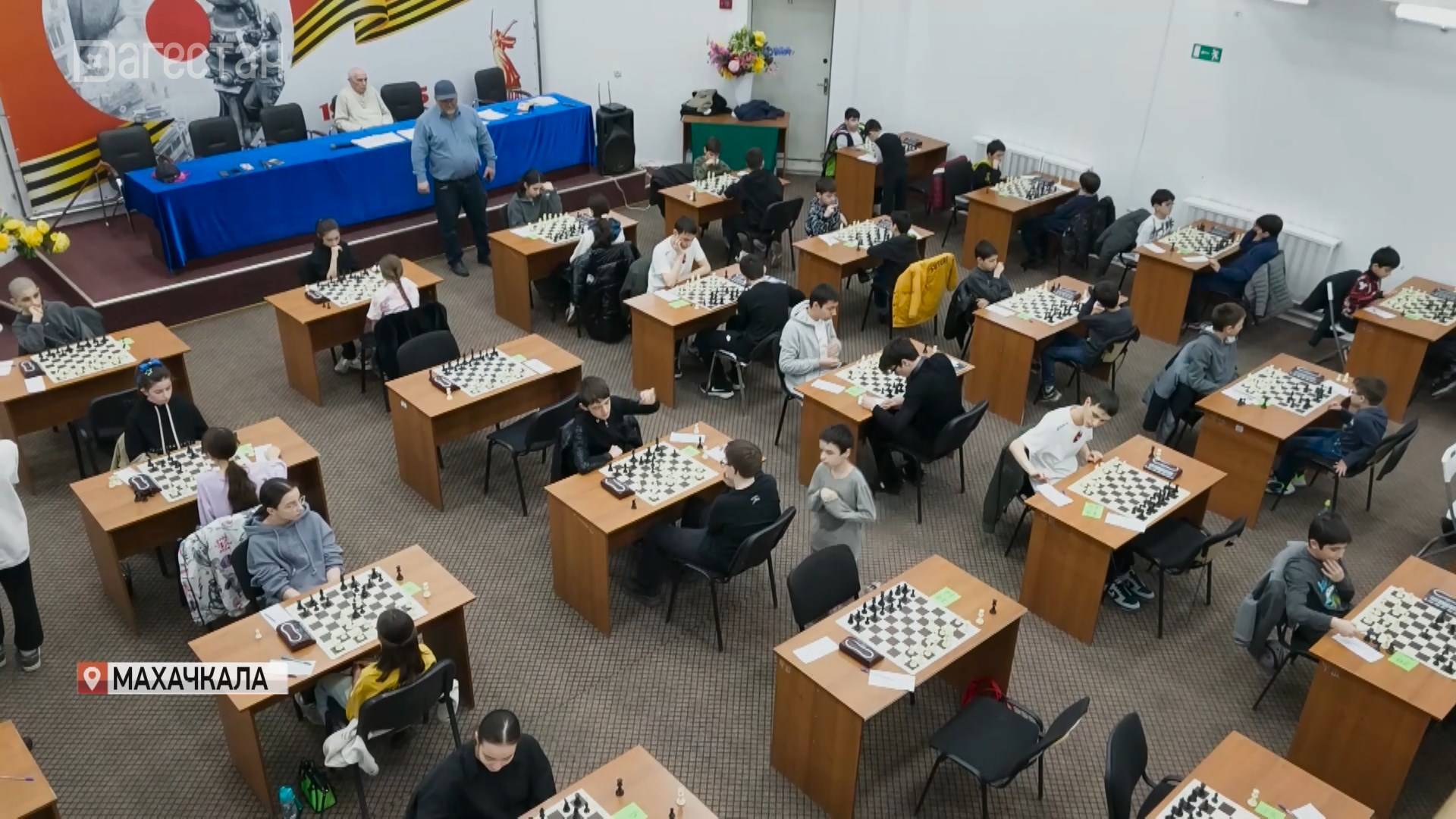 В Махачкале, в спортивной школе имени Анатолия Карпова, проходит Первенство города по шахматам. Соревнования посвятили восьмидесятилетию Победы в Великой Отечественной войне. За играми первого тура поединков наблюдал Дан Шугом.
